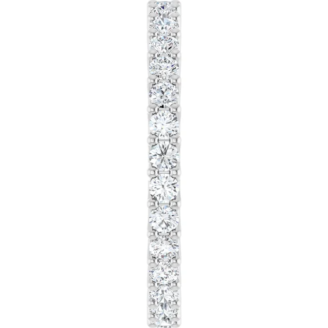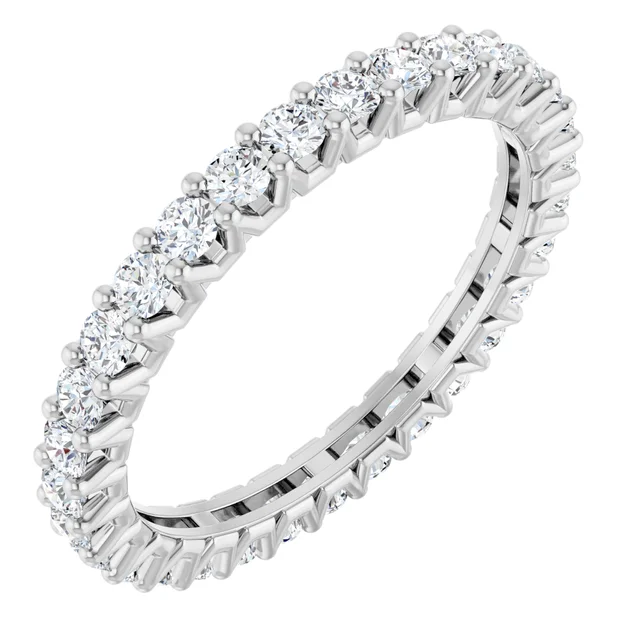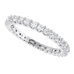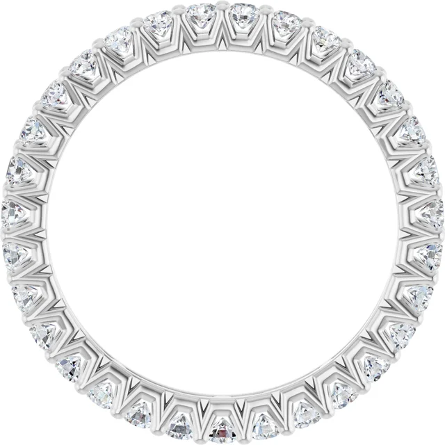 This 14k white gold eternity ring is set with DEF/VVS 2.0mm moissanite gems.
