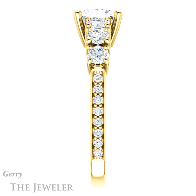 - This design can be set with your choice of certified lab grown diamond or moissanite center gem.Â
