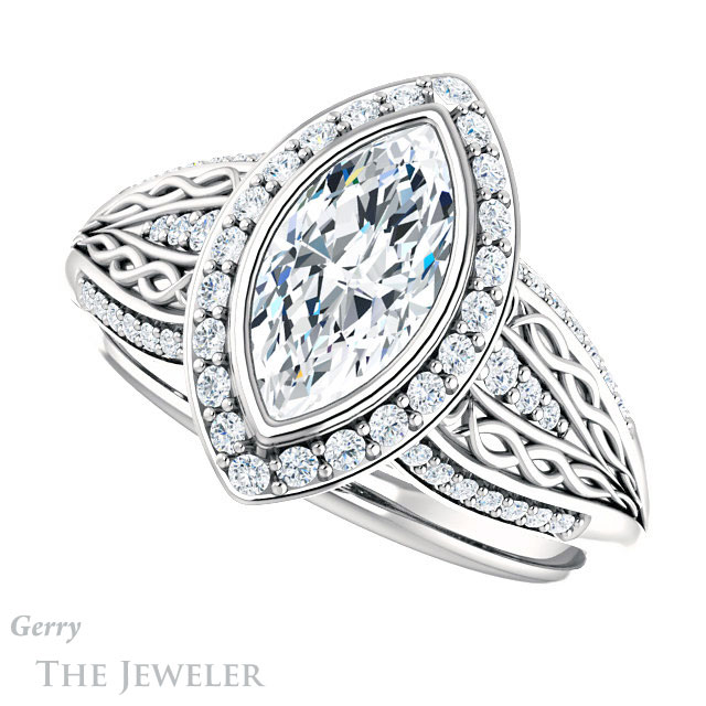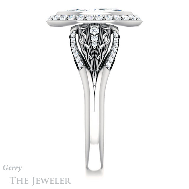 - This design can be set with your choice of certified lab grown diamond or moissanite center gem.Â