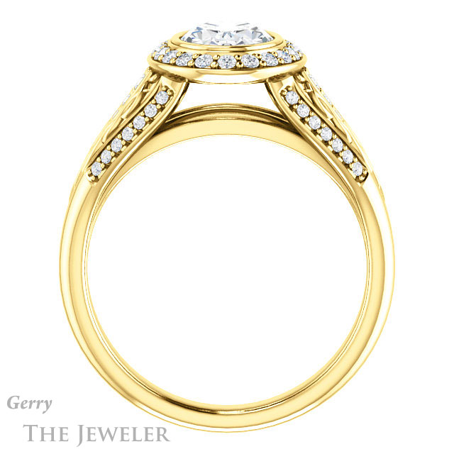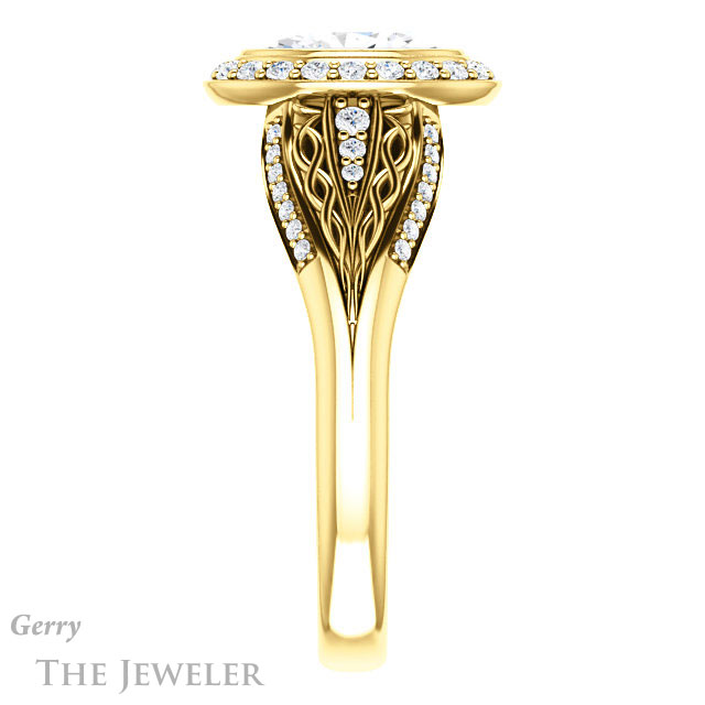 - This design can be set with your choice of certified lab grown diamond or moissanite center gem.Â