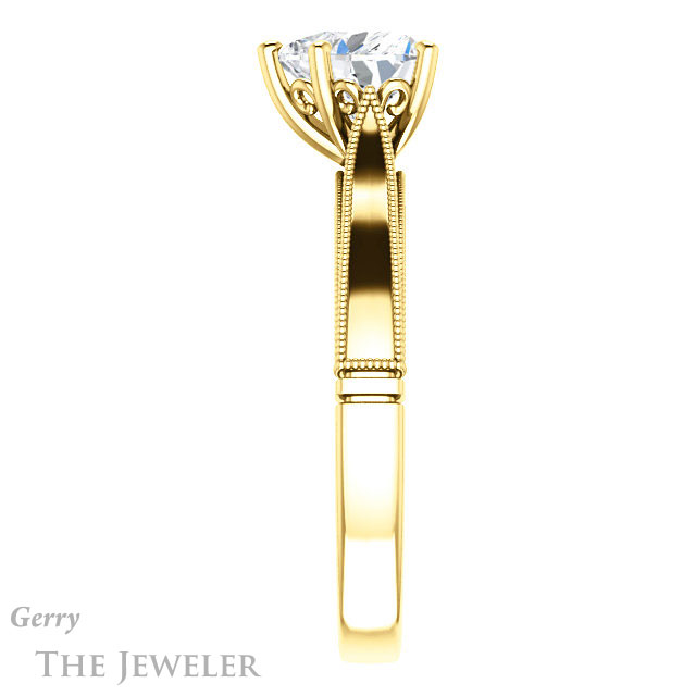- This design can be set with your choice of certified lab grown diamond or moissanite center gem.Â