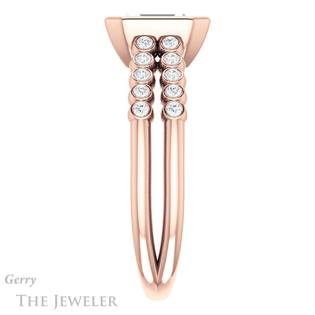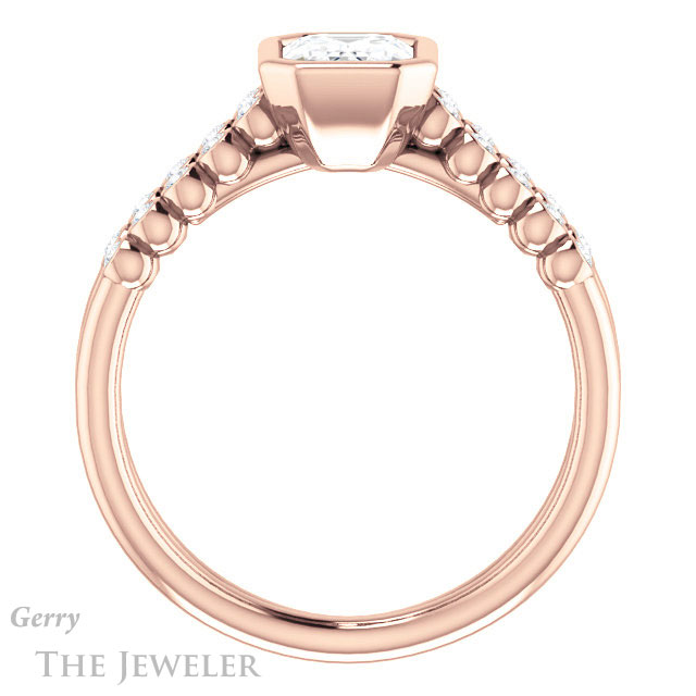 - This design can be set with your choice of certified lab grown diamond or moissanite center gem.Â