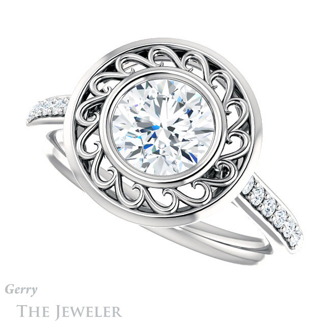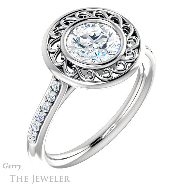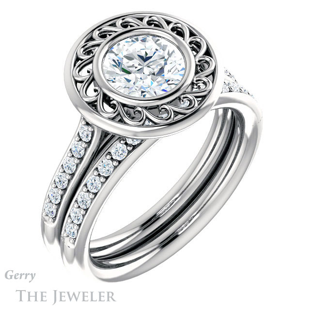 - This design can be set with your choice of certified lab grown diamond or moissanite center gem.Â
