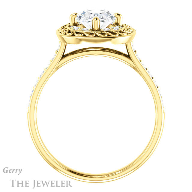 - This design can be set with your choice of certified lab grown diamond or moissanite center gem.Â