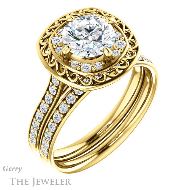 - This design can be set with your choice of certified lab grown diamond or moissanite center gem.Â
