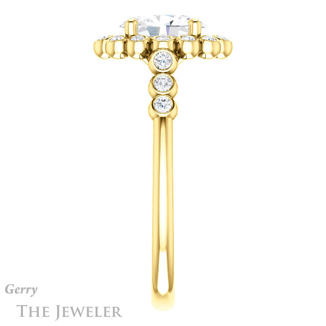 - This design can be set with your choice of certified lab grown diamond or moissanite center gem.Â