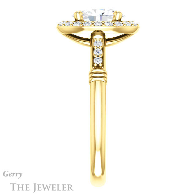 - This design can be set with your choice of certified lab grown diamond or moissanite center gem.Â