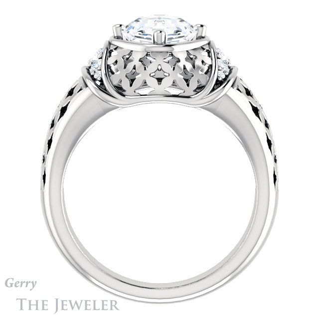 - This design can be set with your choice of certified lab grown diamond or moissanite center gem.Â
