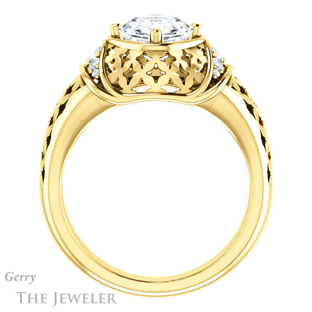 - This design can be set with your choice of certified lab grown diamond or moissanite center gem.Â