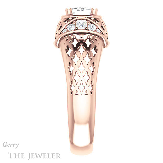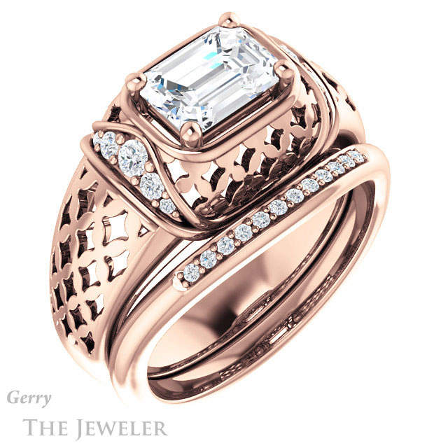 - This design can be set with your choice of certified lab grown diamond or moissanite center gem.Â
