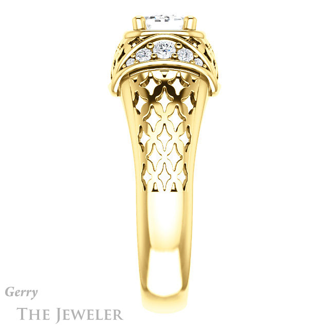 - This design can be set with your choice of certified lab grown diamond or moissanite center gem.Â