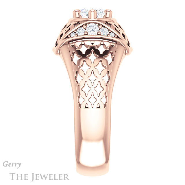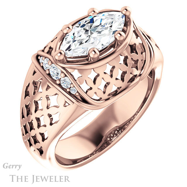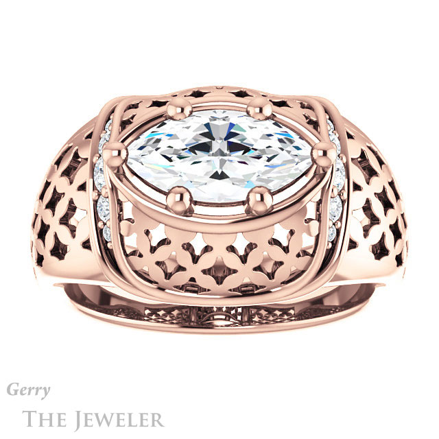 - This design can be set with your choice of certified lab grown diamond or moissanite center gem.Â