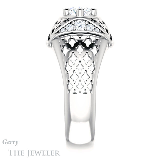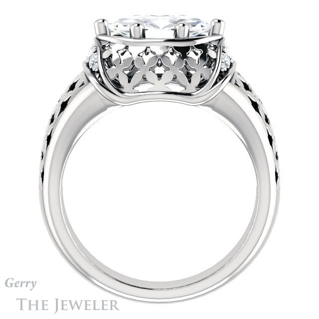 - This design can be set with your choice of certified lab grown diamond or moissanite center gem.Â