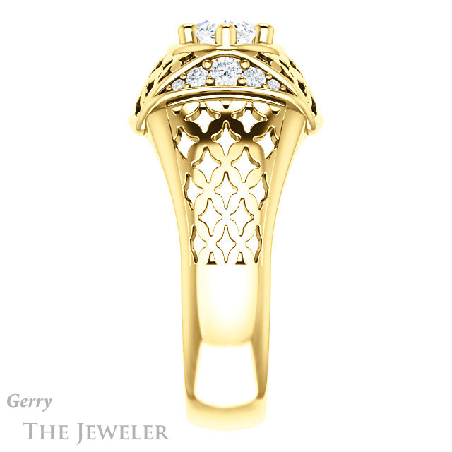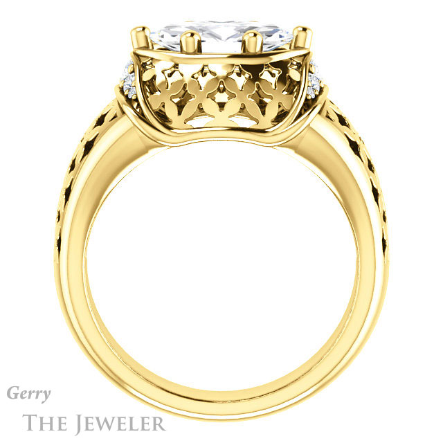 - This design can be set with your choice of certified lab grown diamond or moissanite center gem.Â