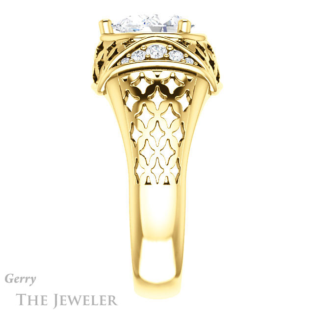- This design can be set with your choice of certified lab grown diamond or moissanite center gem.Â