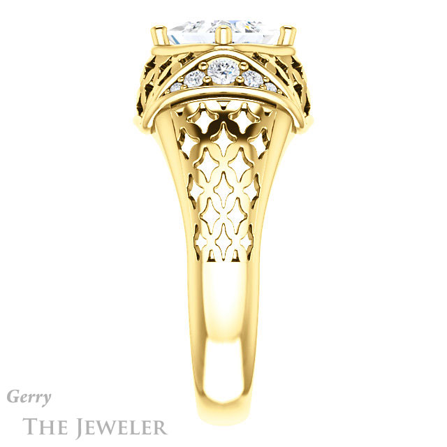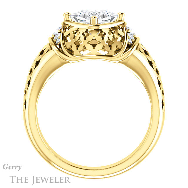 - This design can be set with your choice of certified lab grown diamond or moissanite center gem.Â