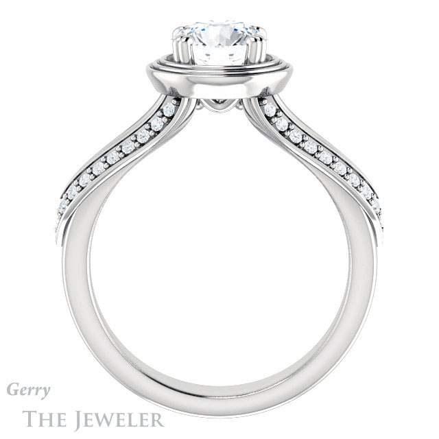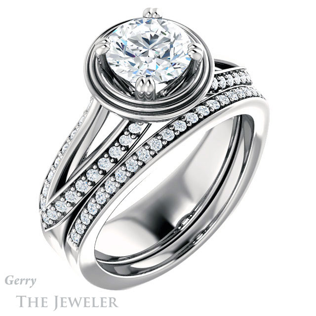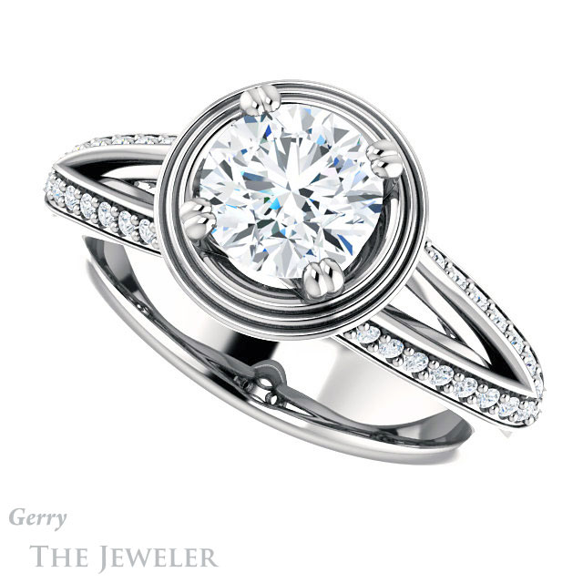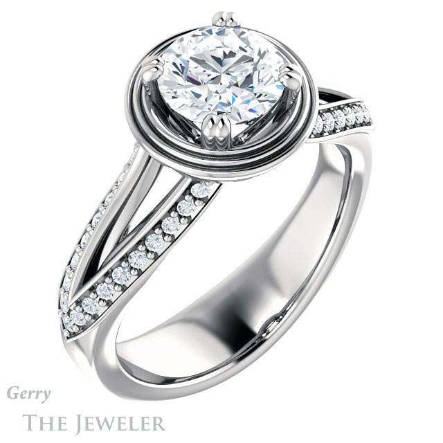 - This design can be set with your choice of certified lab grown diamond or moissanite center gem.Â