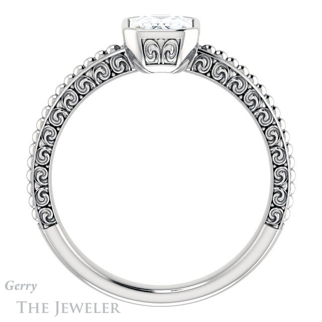 - This design can be set with your choice of certified lab grown diamond or moissanite center gem.Â