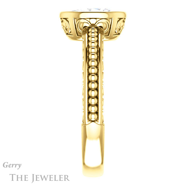 - This design can be set with your choice of certified lab grown diamond or moissanite center gem.Â