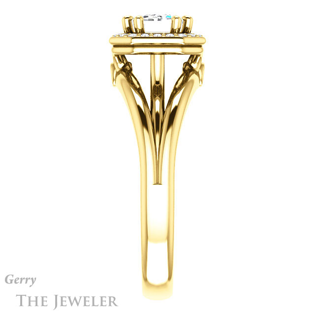 - This design can be set with your choice of certified lab grown diamond or moissanite center gem.Â