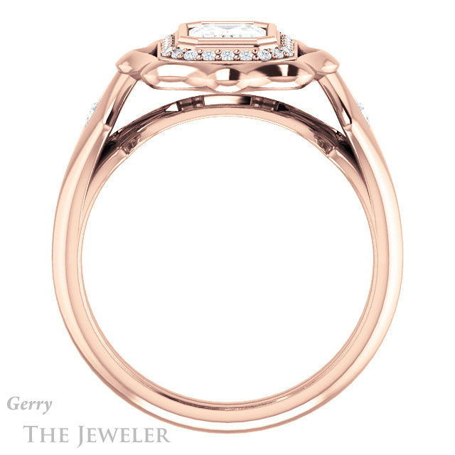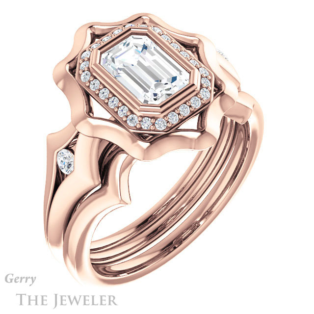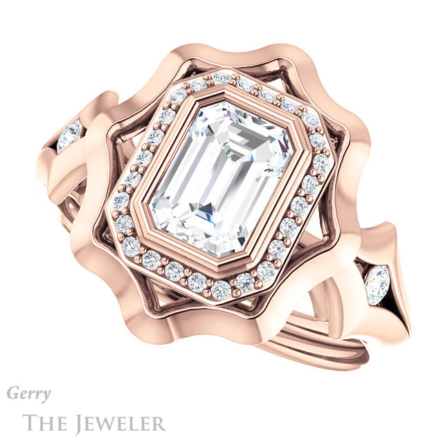 - This design can be set with your choice of certified lab grown diamond or moissanite center gem.Â
