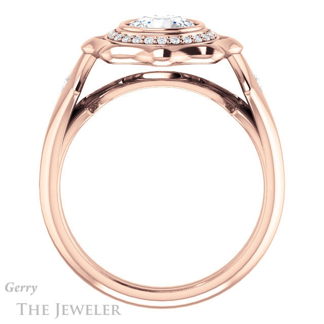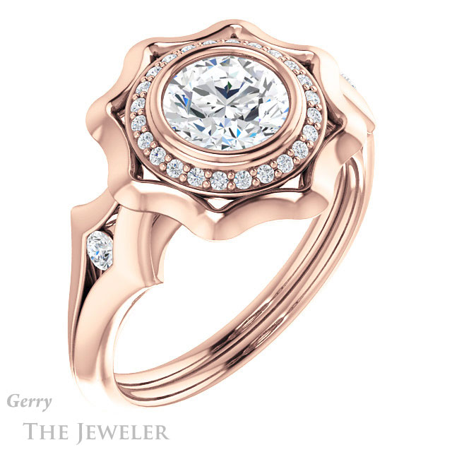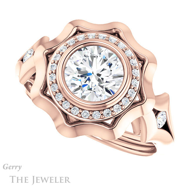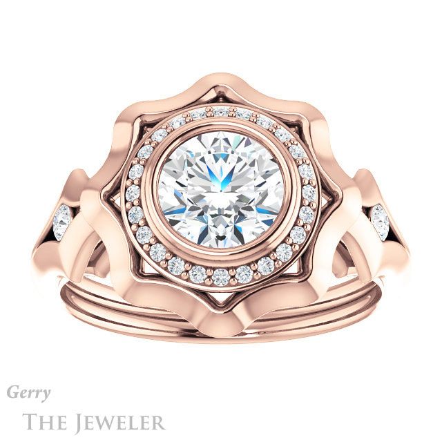 - This design can be set with your choice of certified lab grown diamond or moissanite center gem.Â