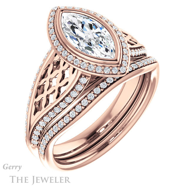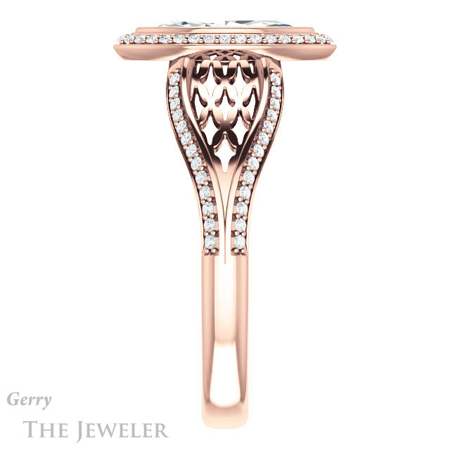 - This design can be set with your choice of certified lab grown diamond or moissanite center gem.Â