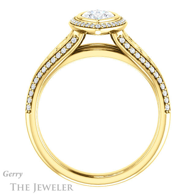 - This design can be set with your choice of certified lab grown diamond or moissanite center gem.Â