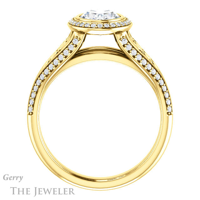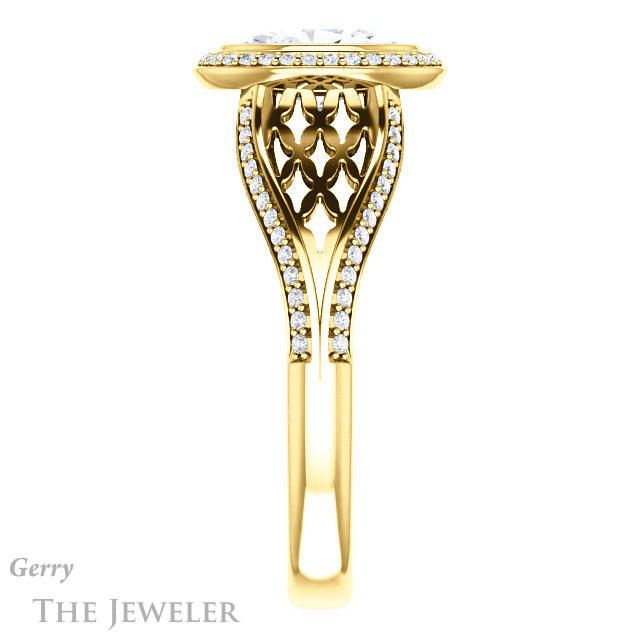 - This design can be set with your choice of certified lab grown diamond or moissanite center gem.Â