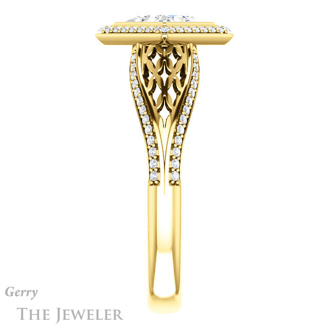 - This design can be set with your choice of certified lab grown diamond or moissanite center gem.Â