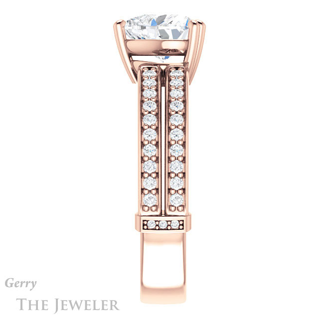 - This design can be set with your choice of certified lab grown diamond or moissanite center gem.Â