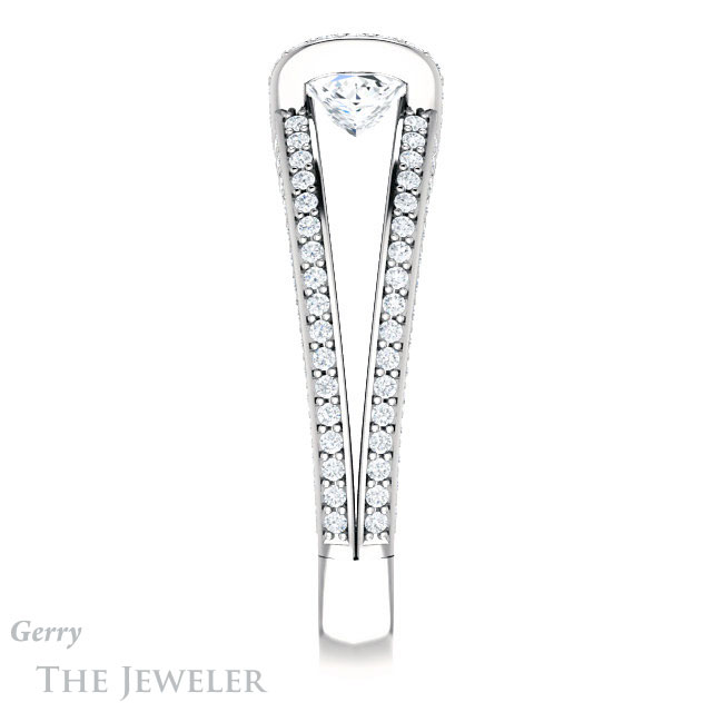 - This design can be set with your choice of certified lab grown diamond or moissanite center gem.Â
