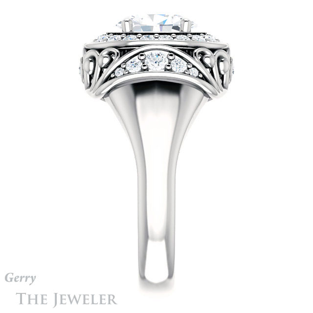 - This design can be set with your choice of certified lab grown diamond or moissanite center gem.Â
