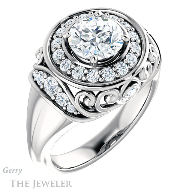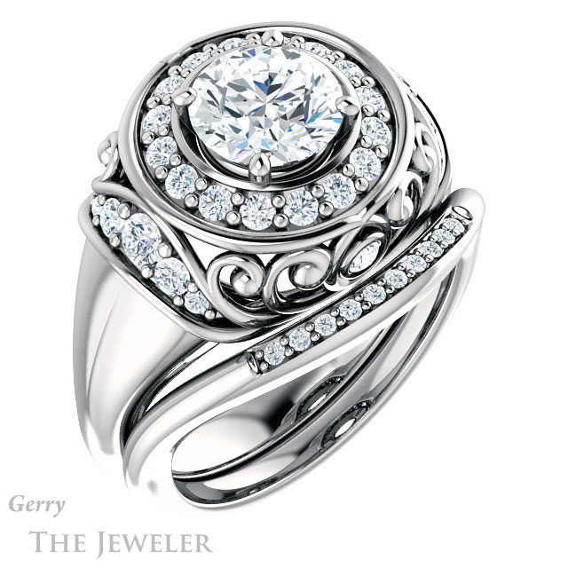 - This design can be set with your choice of certified lab grown diamond or moissanite center gem.Â