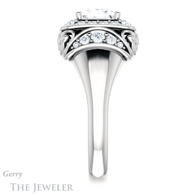 - This design can be set with your choice of certified lab grown diamond or moissanite center gem.Â