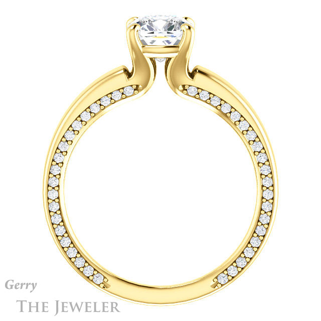 - This design can be set with your choice of certified lab grown diamond or moissanite center gem.Â